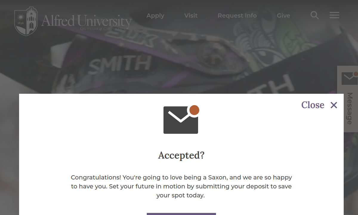 Alfred University is a private university located in Alfred, NY, serving approximately 1,401 students. It has an acceptance rate of 48%.